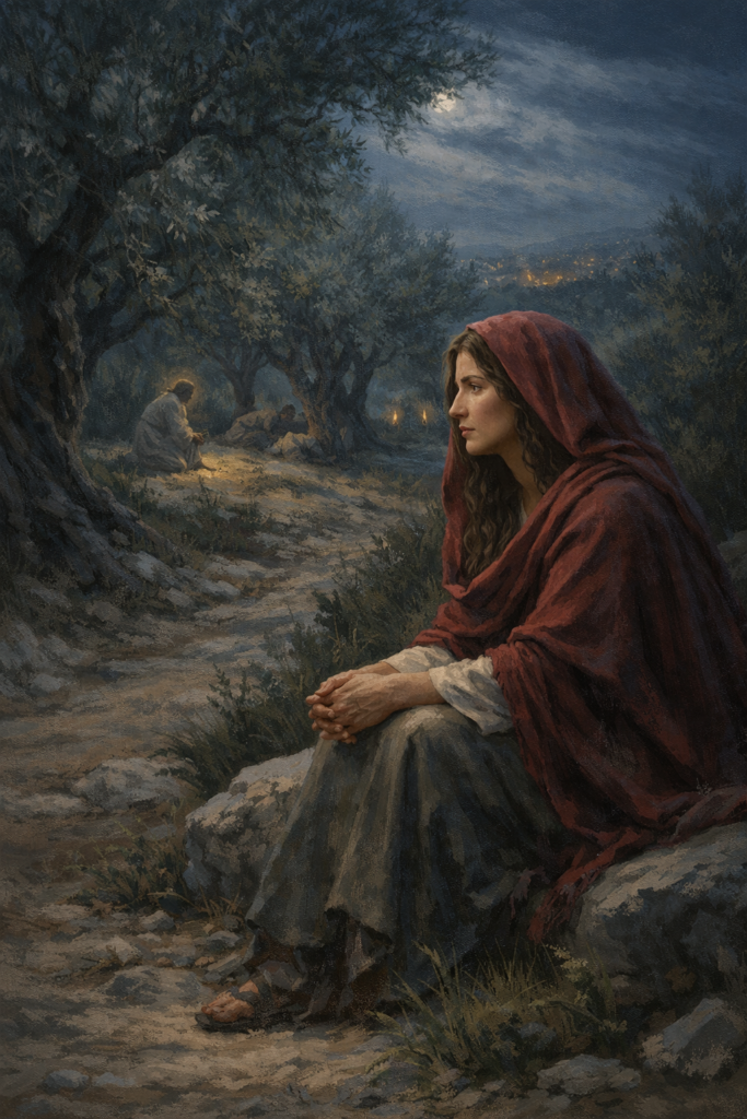 Jesus steps back into the half-light, almost dissolving. The garden breathes. Morning finally arrives, but it is no longer the same.