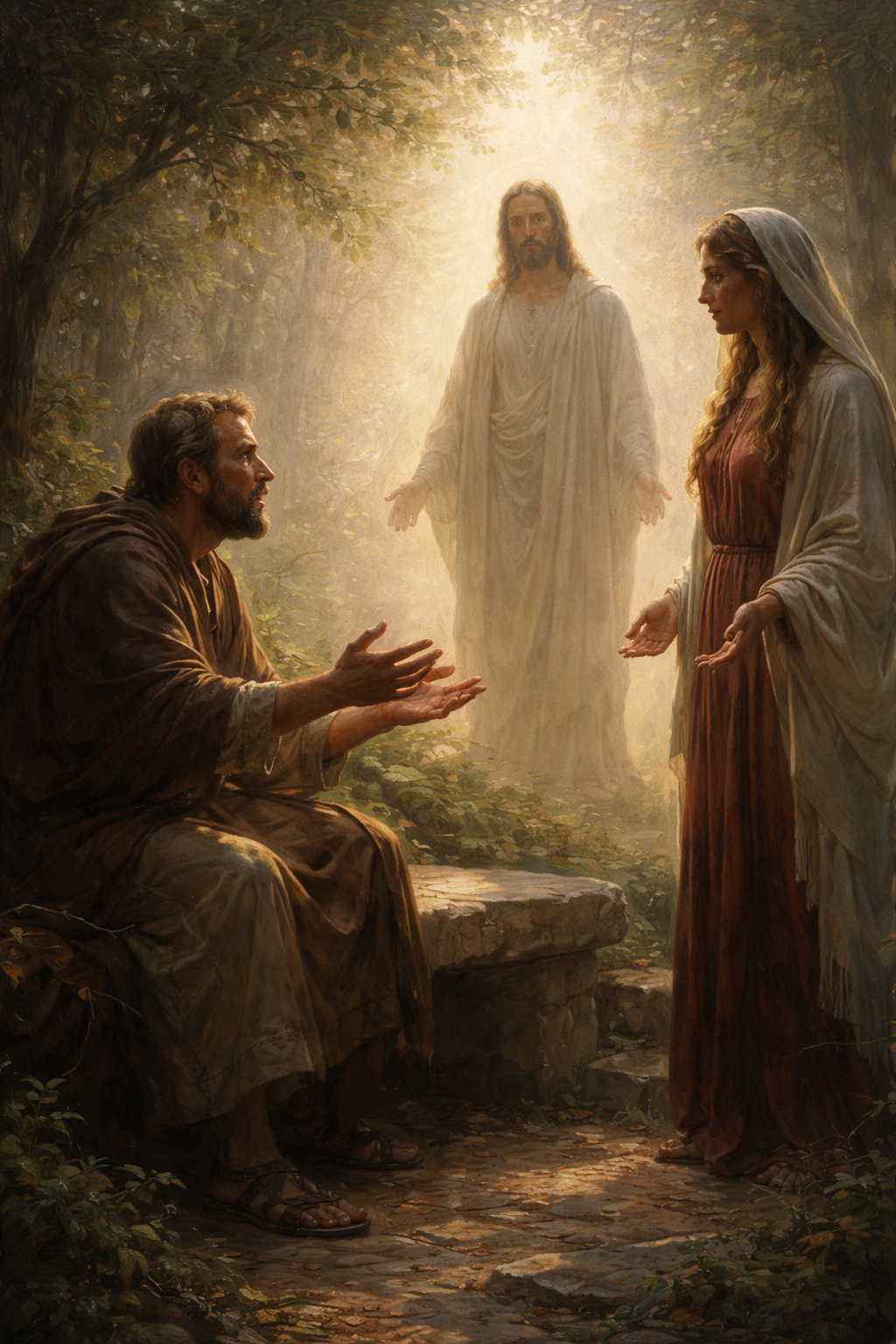 (The garden seems to lean in. The air thickens. Jesus steps forward—light radiates but does not burn. His voice is calm, omnipresent.)